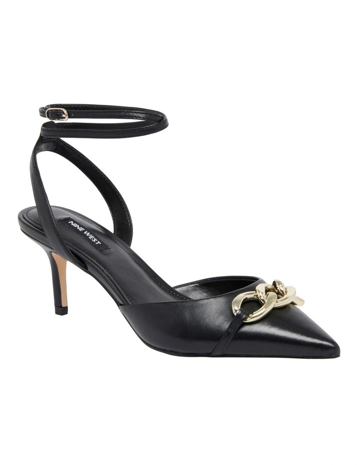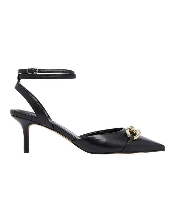 Step into new season style with the Arnice Pump. Update your wardrobe essentials with this pointed toe, open back silhouette. Featuring a plush footbed and mid height stiletto heel for ultimate comfort, the adjustable wrap around ankle strap fastening keeps you secure yet stylish for an all-day wear. Resting on the pointed toe is a chunky chain detail, creating a dose of joy within this statement heel. Arnice will look elegantly chic peeing out of relaxed tailoring or paired with a midi skirt and blazer.