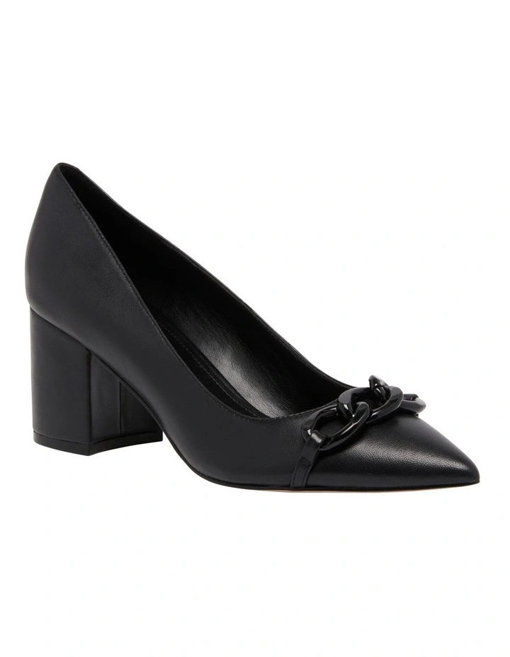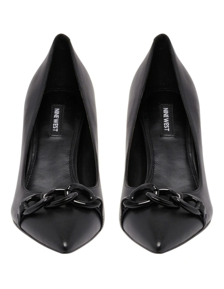 The Nine West Jezzie is set on a mid block heel with a classic pointed toe. Defined by its elegant silhouette and modern chain detailing across the vamp giving a sophisticated yet chic style choice. Ideal for pulling together an office-appropriate outfit.